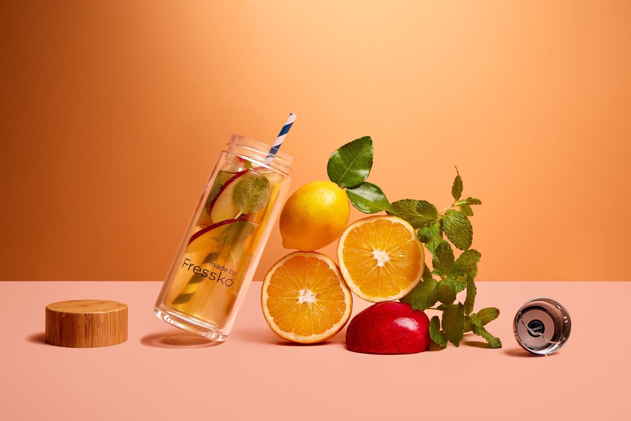 Add apple and orange slices, along with mint leaves to a Rise Fressko Flask.